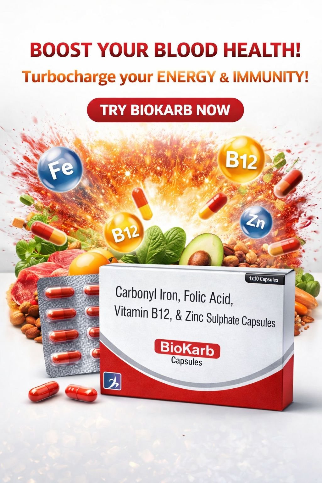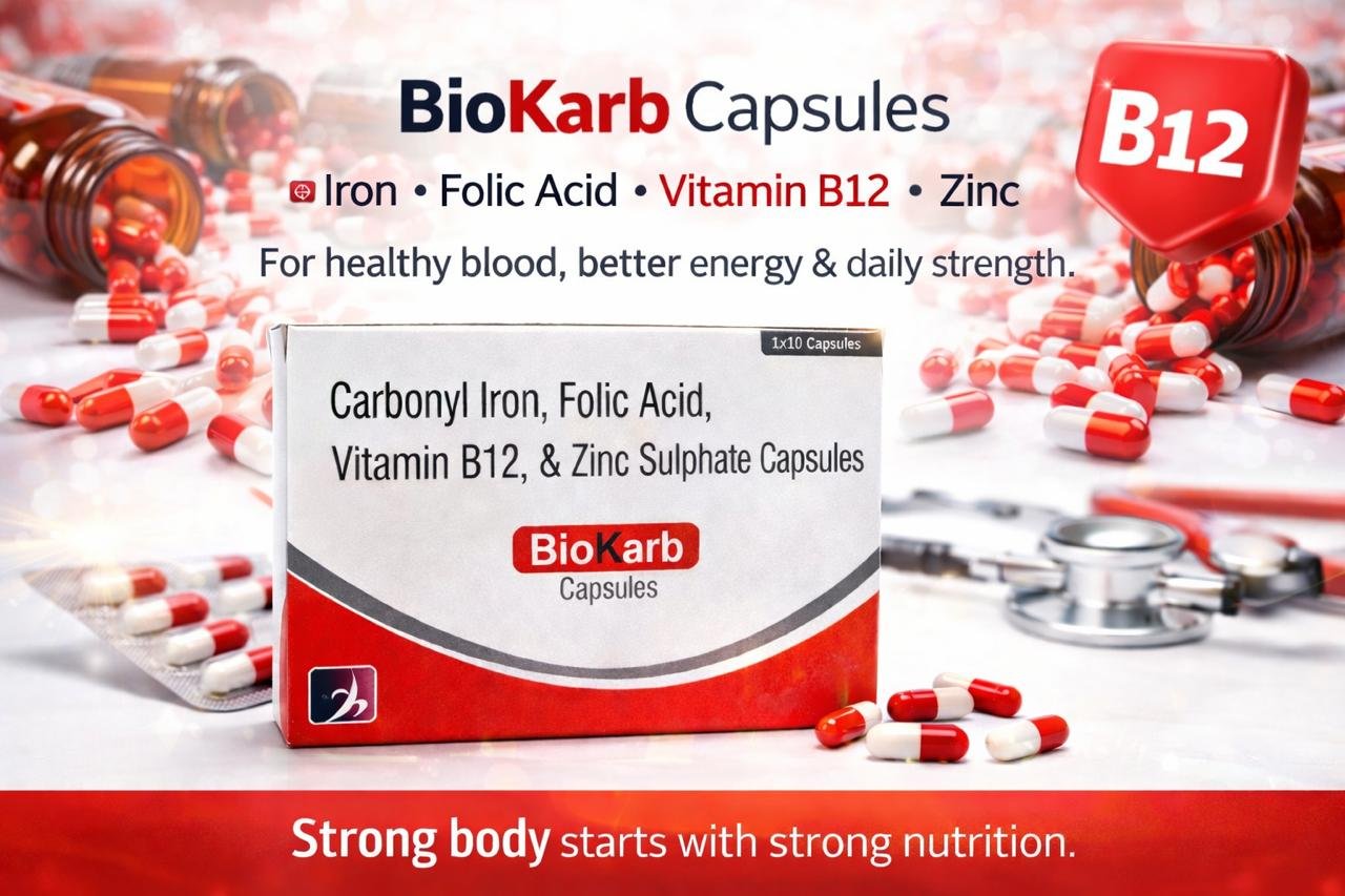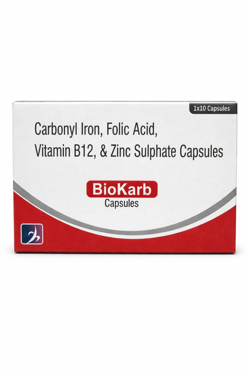 •Folic acid — essential vitamin (vitamin B9) important for DNA synthesis and formation of red blood cells. Its inclusion makes Biokarb effective where folate deficiency contributes to anemia.